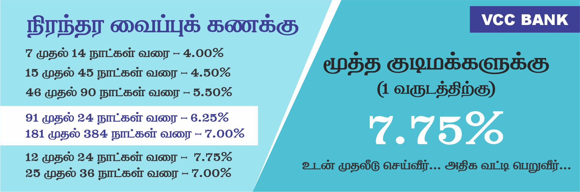வேலூர் மாவட்ட மத்தியக் கூட்டுறவு வங்கியில் குறைந்த வட்டியில் உடனடியாக நகைக்கடன் வழங்கப்படுகிறது. தேவைப்படுவோர் அருகில் உள்ள வேலூர் மாவட்ட மத்தியக் கூட்டுறவு வங்கியின் கிளைகளை அணுகி பெற்று பயனடையுமாறு அன்புடன் கேட்டுக்கொள்கிறோம். இணைப்பதிவாளர்/மேலாண்மை இயக்குநர், வேலூர் மாவட்ட மத்தியக் கூட்டுறவு வங்கி.,